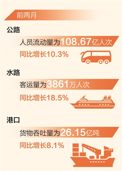货运量稳步增长。前两月,我国公路货运量达到54.54亿吨,同比增长7.8%;水路货运量近14亿吨,同比增长10.2%。